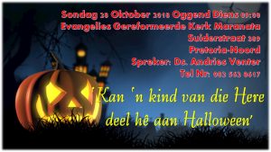 Halloween?This entry was posted in Uncategorized on 26 October, 2018 by Janine Ons wil graag almal uitnooi na ons oggend diens Sondag die 28ste Oktober 2018 @ 09:00. Ons spreker, Ds Andries Venter gaan die ewigdurende strydvrae oor Halloween en kinders van God bespreek. Moet dit nie misloop nie! Tweet Share 0 +1